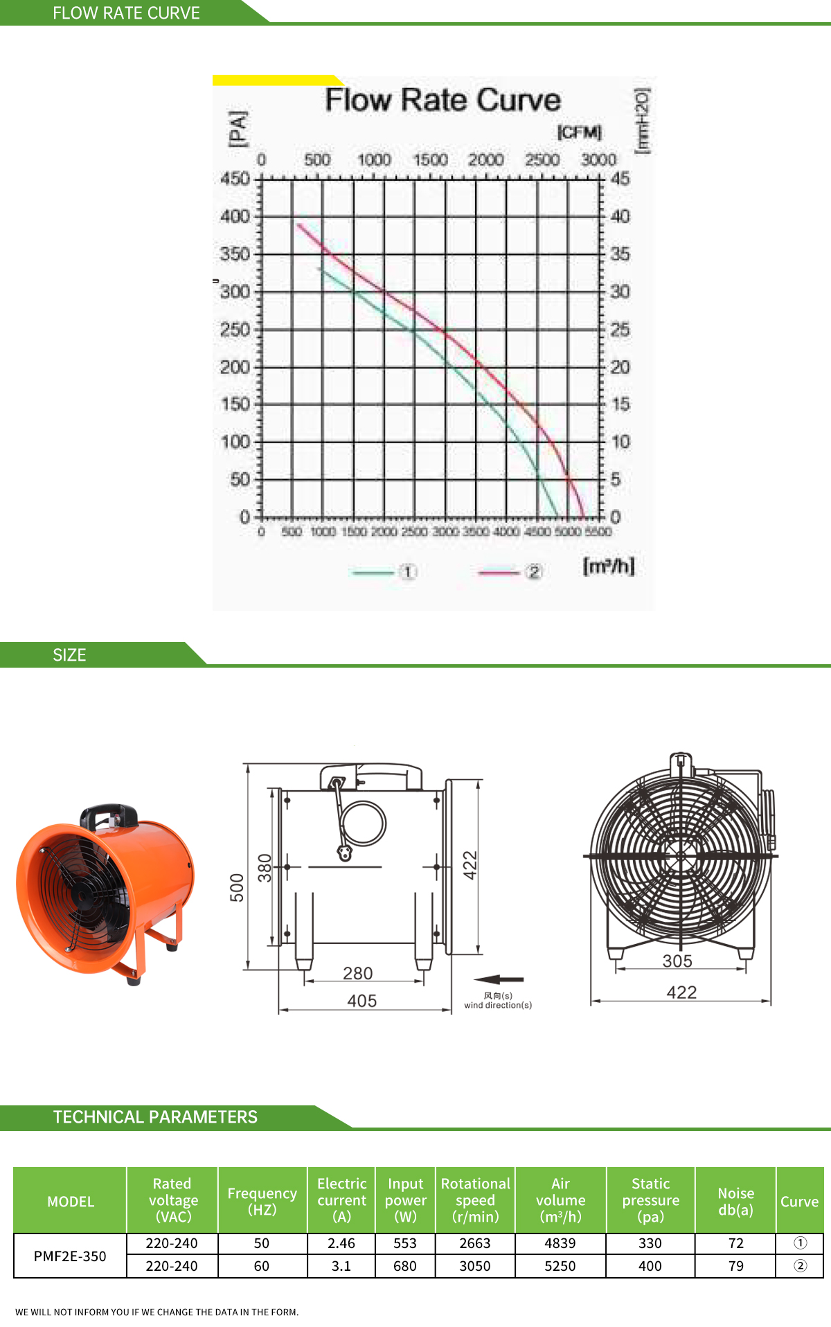Fan steering: counterclockwise (from the outlet end) Bearing: maintenance-free ball bearing protection level: IP54 ambient temperature: -30~60°C