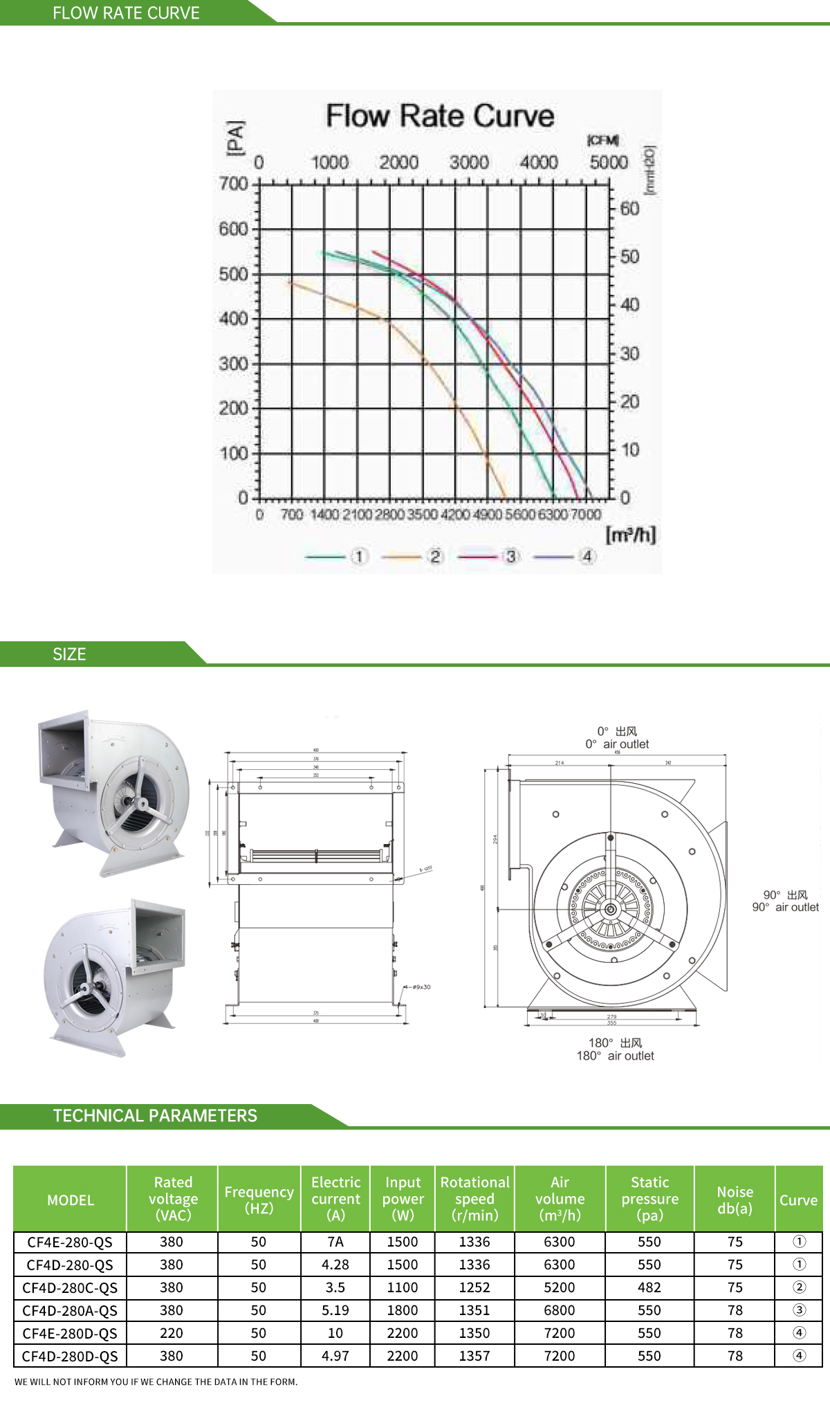The design of the forward curved blades combined with the double air inlet structure improves the air intake efficiency, and the air volume range is up to 1000~20000 m³/h.