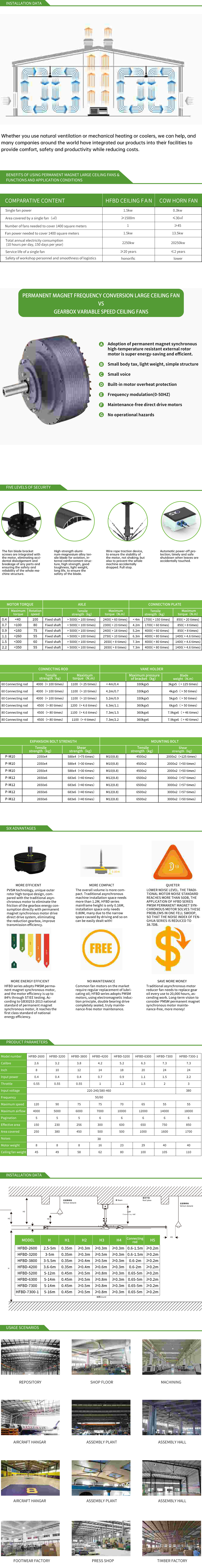 HFBD series is an innovative permanent magnet frequency conversion large ceiling fan designed for high space environment, through the bionic natural wind technology, combined with high efficiency energy saving and intelligent control, to provide a full range of three-dimensional ventilation and cooling solutions for industrial, commercial and public space, taking into account human comfort and energy efficiency.