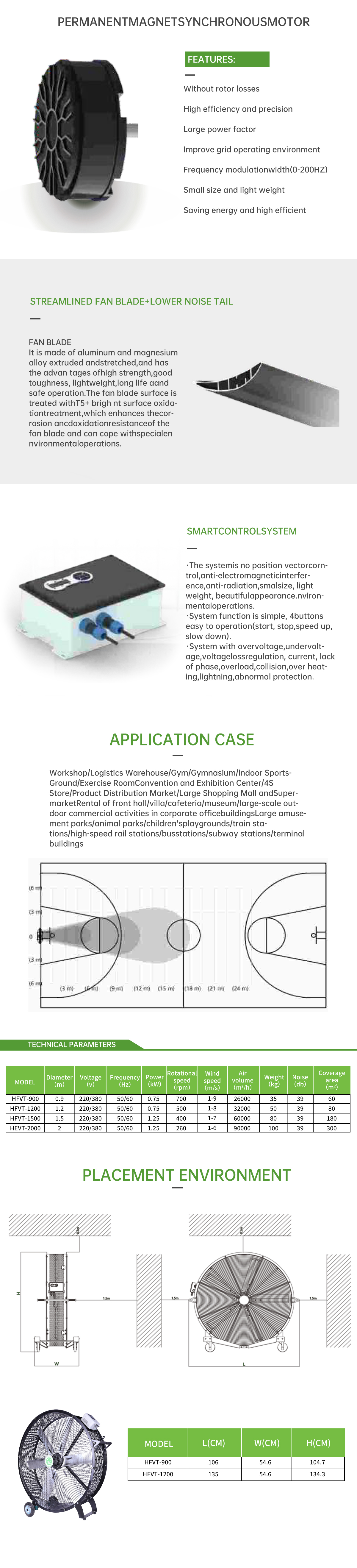 HFVT系列永磁变频大风扇独特的机翼型设计叶片直径0.9~2m,采用空气动力学原理和先进